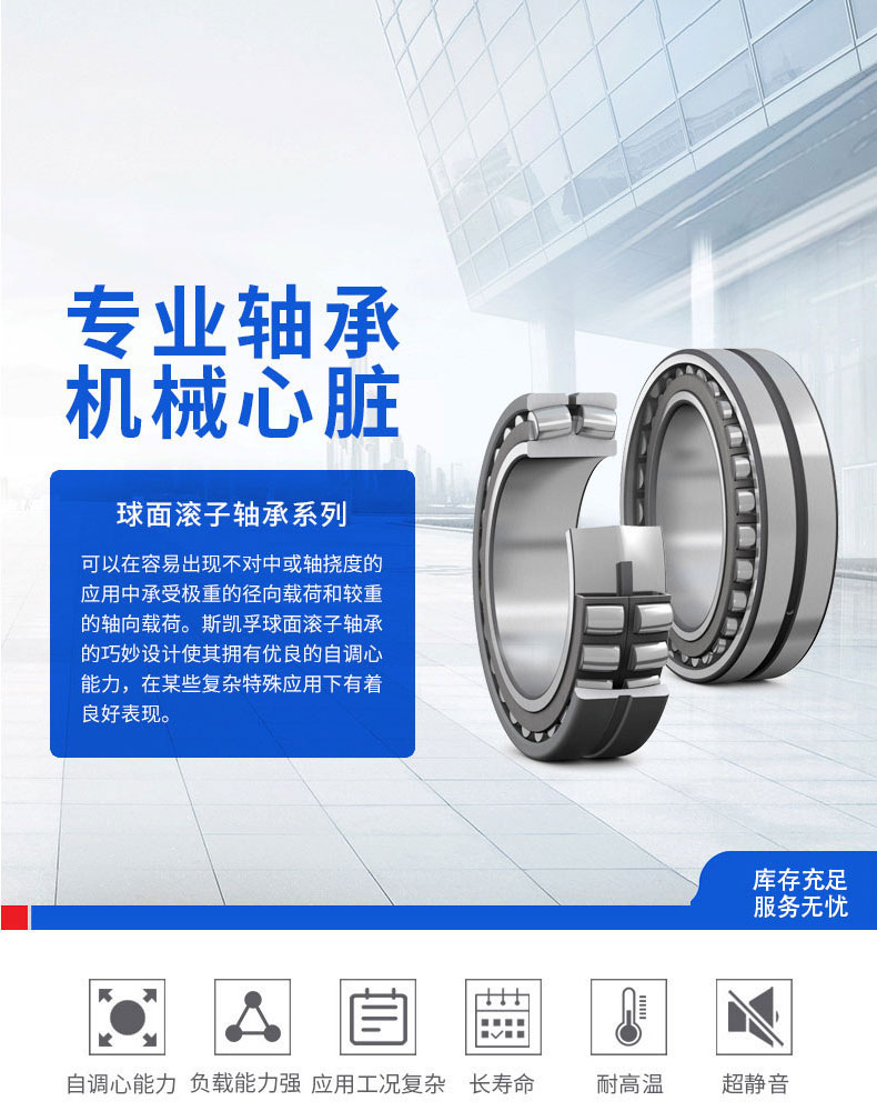 SKF球面滚子轴承的滚子的制造极为严格的公差尺寸和形式。每个辊子在集合中的其它辊的尺寸和形状几乎是相同的。优化负荷分布辊轴承的使用寿命最大化。